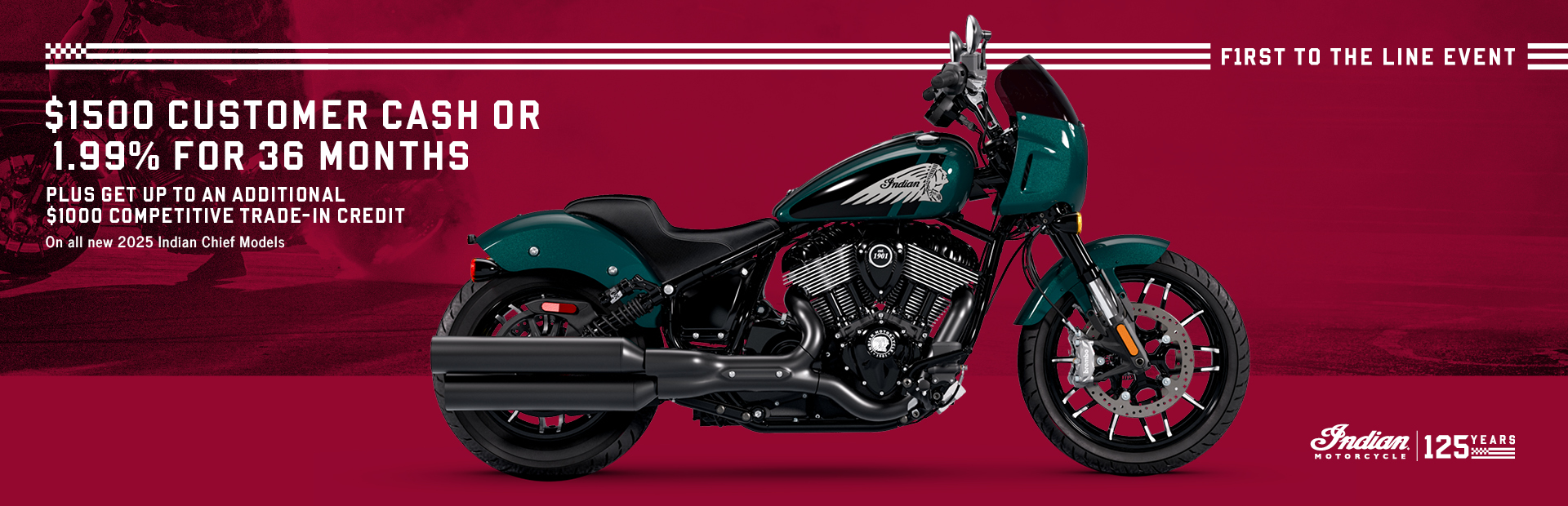 This is a limited time offer which is valid for the purchase of selected qualifying models and is subject to credit approval on qualified purchases financed during this program. Offer may not be combined with certain other offers (specifically trade-in credit or customer cash), is subject to change and may be extended or terminated without further notice. Offer valid on select new 2025 models (excludes Elites): MY25 Indian Springfield models, MY25 Chieftain models, MY25 Roadmaster models, MY25 PowerPlus family (Chieftain PowerPlus, Roadmaster PowerPlus, Indian Challenger, or Indian Pursuit), or MY25 Chief models (2025 Indian Chief, Chief Bobber, Super Chief and Sport Chief models). Monthly payment and cost of borrowing will vary depending on amount borrowed and down payment/trade. Minimum financing amount varies, check with your Indian Motorcycle dealership for minimum financing details. Example: $14,999 financed at 1.99% APR over 36 months = 36 monthly payments of $386.59. Financed amount of $13,499 with 10% down payment, total cost of borrowing of $418.14, and a total obligation of $13,917.14. An example of monthly payments required on a 36-month term at 1.99% APR is $28.64 per $1,000 financed. Monthly payment examples do not include taxes, title, license, or other fees.Offer only valid to qualified customers, not all customers will qualify, other offers available, see dealer for details. Excludes all Elite Models. Offer Valid: April 1 – 30, 2026.